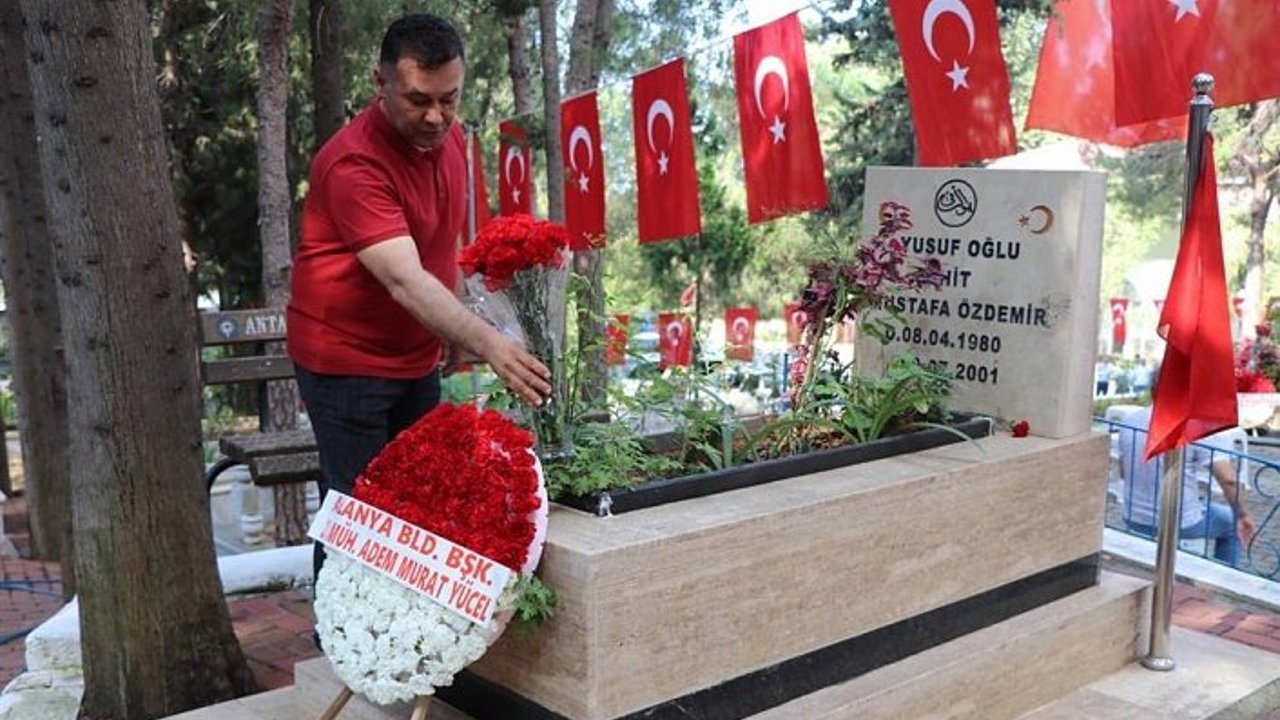 Alanya Belediye Başkanı Adem Murat Yücel, Kurban Bayramı arifesinde Alanya Garnizon Şehitliği’ni ziyaret etti. Alanya Müftü Vekili Personel Şube Müdürü Mehmet Fatih Arslan’la birlikte şehitlerimize dua eden Başkan Yücel, şehit yakınları ile de bir araya geldi. Şehitlerimizin mezarlarına karanfil sunan Başkan Yücel, “Bir kez daha tüm şehitlerimizi rahmet ve minnetle anıyorum.” dedi.